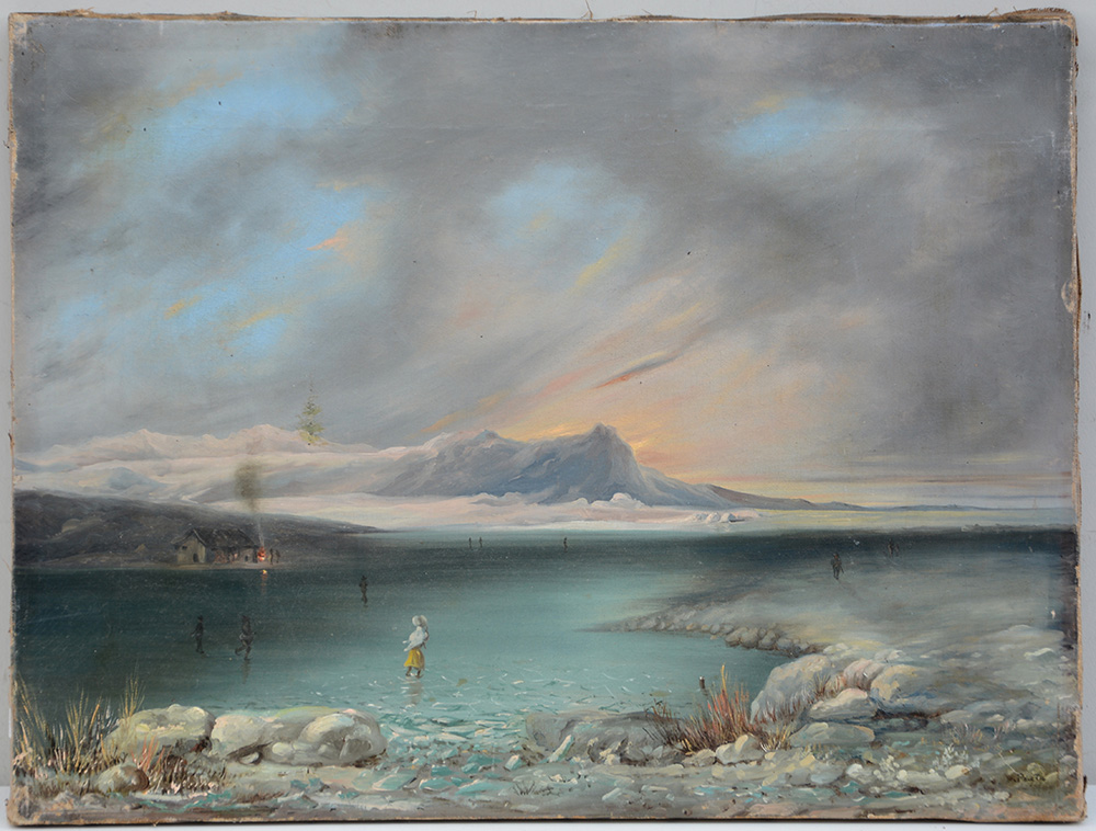 Firma indecifrata "Paesaggio fluviale con figure" olio su tela (cm 45x60) (difetti)