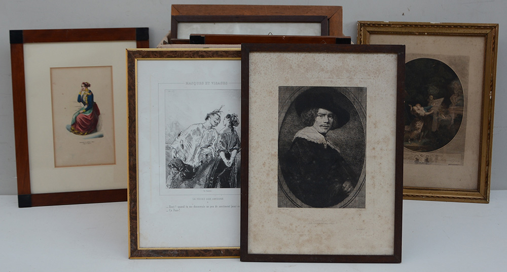Cartone contenente numerose stampe di autori, misure e soggetti diversi, in cornici (difetti)