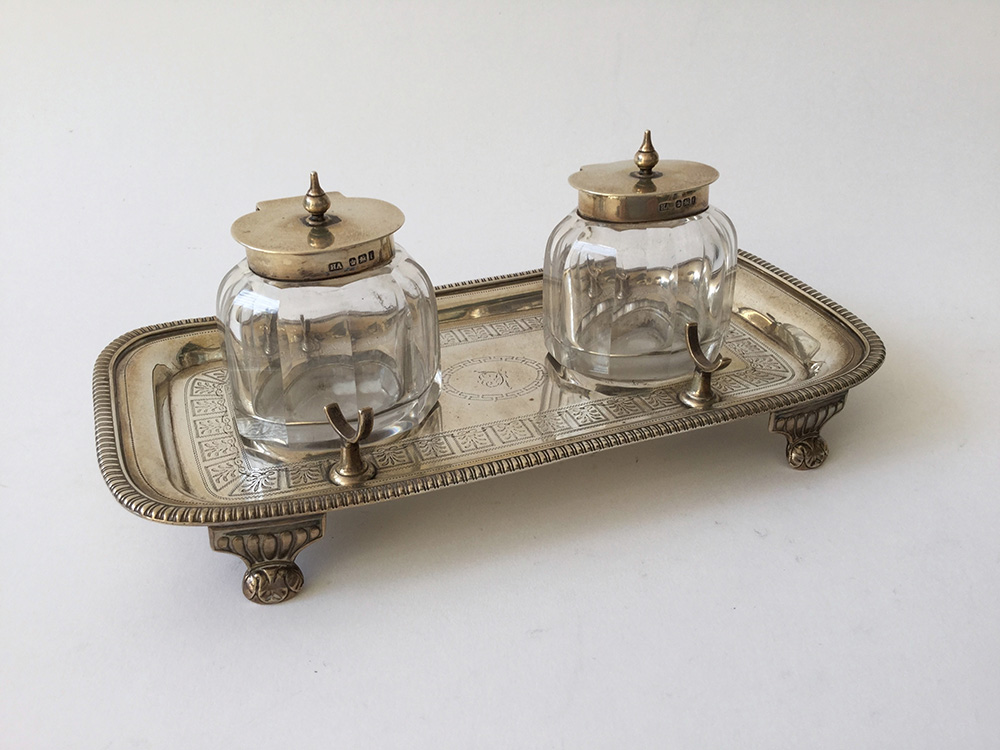 Calamaio in argento con contenitori in vetro sfaccettato, marchi inglesi, g 230 circa (l cm 21) (lievi difetti)