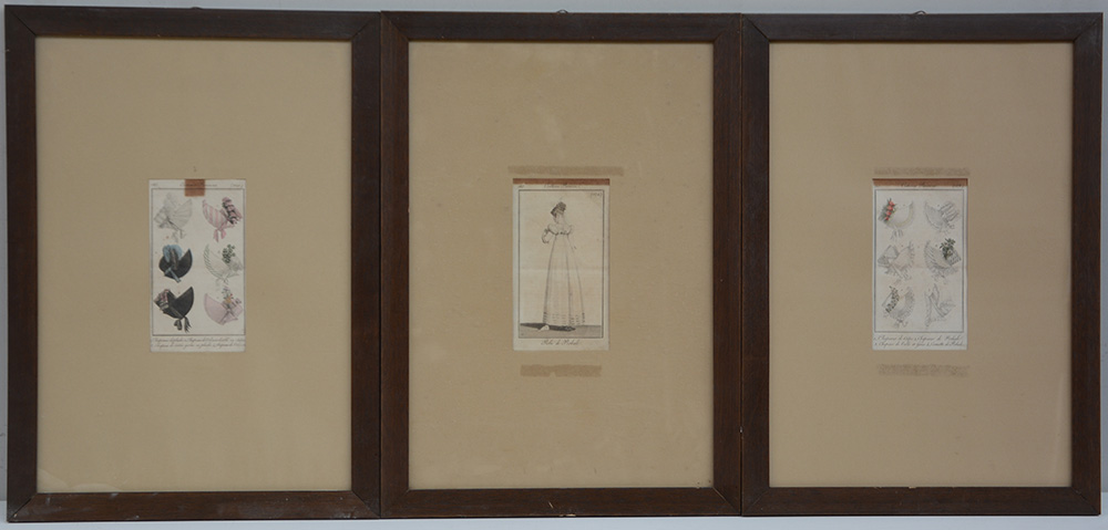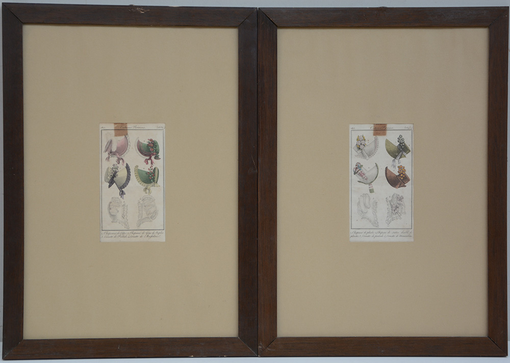 Lotto composto da cinque stampe a colori francesi raffiguranti costumi parigini in cornici (difetti)