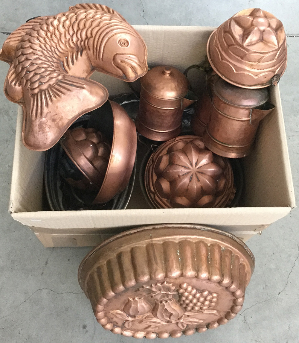 Cartone contenente numerosi oggetti in rame fra cui forme per budini (difetti)