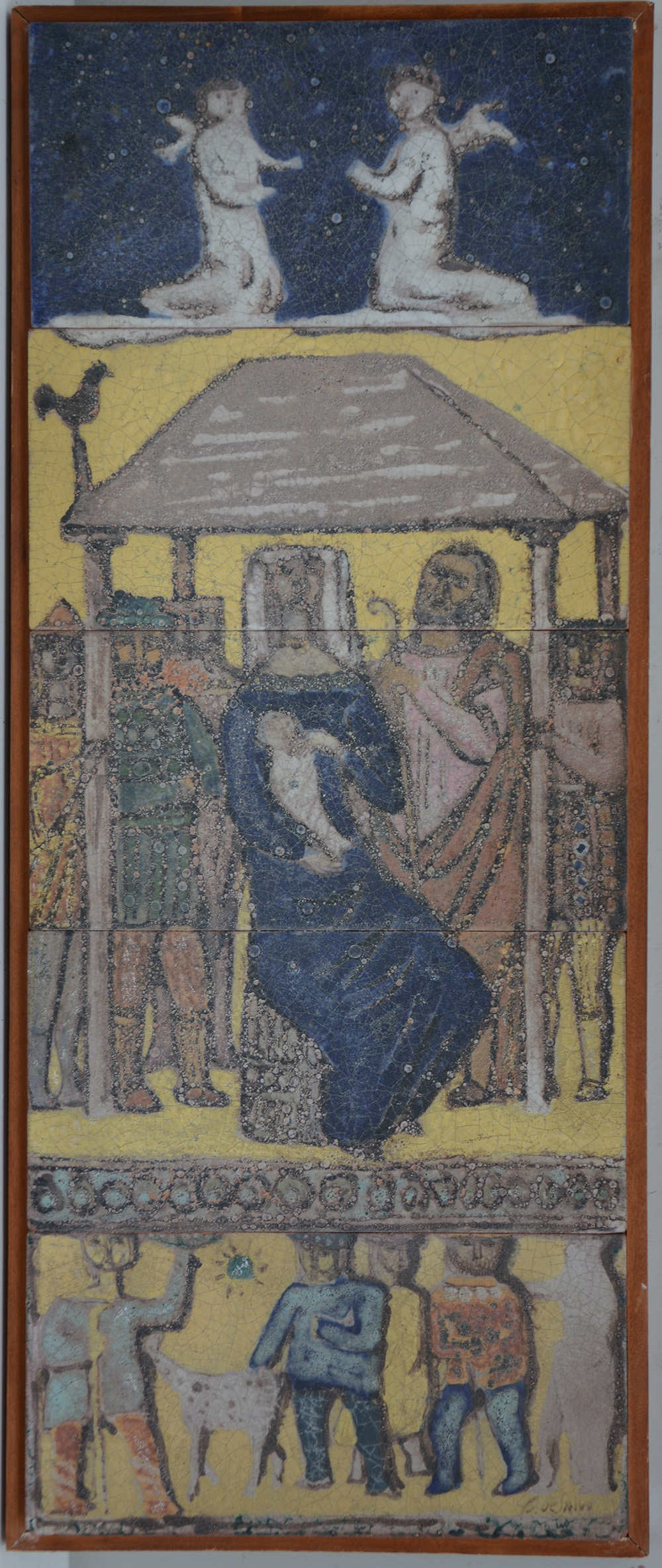 "Natività", composizione di piastrelle in ceramica policroma entro supporto ligneo (cm 70,5x28) firmato in basso a destra (lievi difetti)