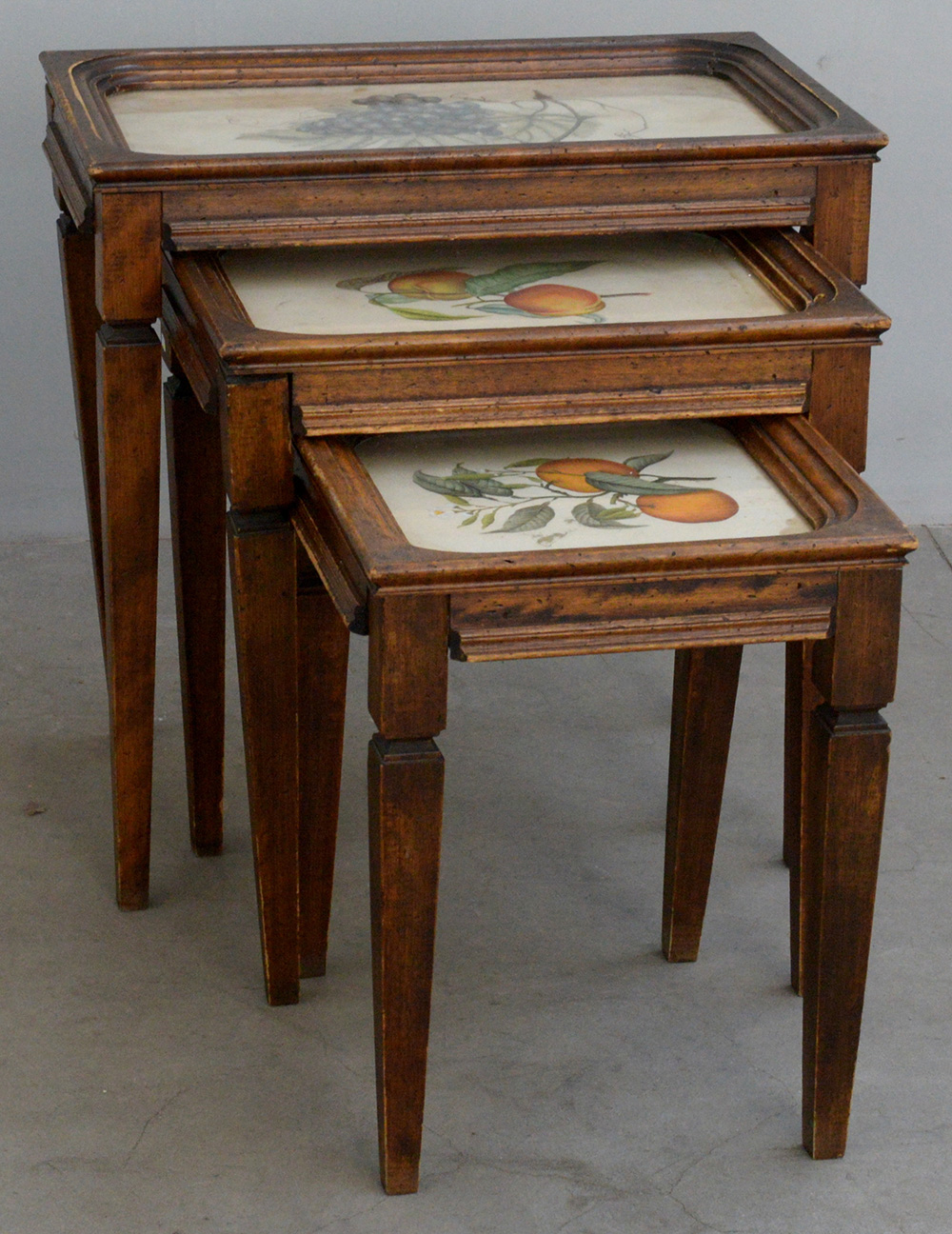 Set di tre tavolini a nido con gambe rastremate, piani con stampe colorate raffiguranti frutti (cm max 58x58x35) (difetti)