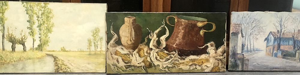 Lotto composto da tre dipinti ad olio raffiguranti natura morta e paesaggi, due dei quali firmati, misure diverse (difetti)
