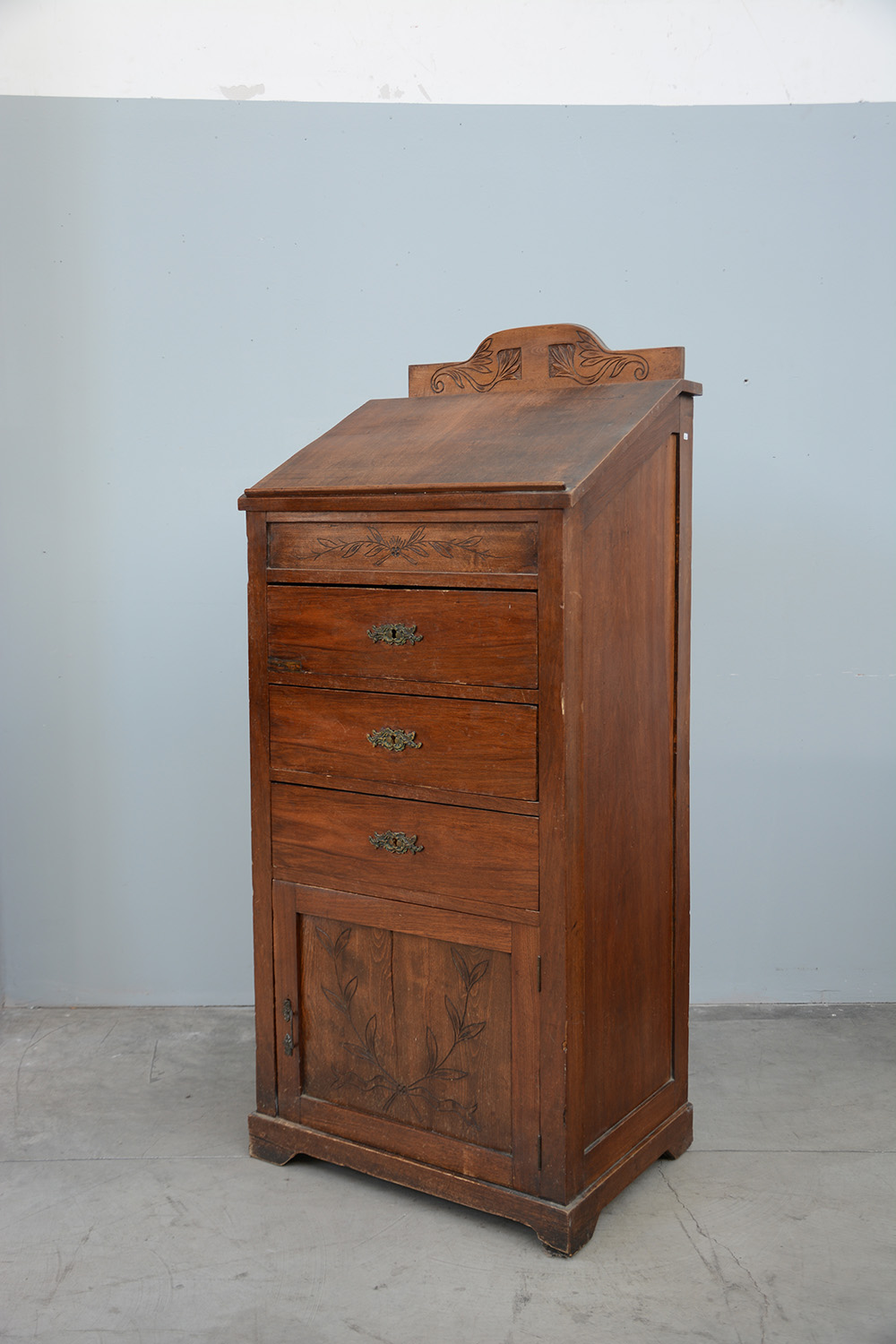 Mobile alto ''liberty'' con tre cassetti sul fronte e anta nella parte inferiore, piano inclinato ''a leggio'', cimasa intagliata (cm 66x151x49) (difetti)