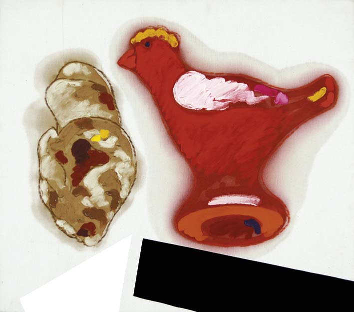 CONCETTO POZZATI Vo ' Vecchio 1935 La visita del cuco 1986 olio su tela, 70x80 firma data e titolo al retro autentica dell'Archivio Pozzati nr. Arch. 2244/12 su foto provenienza Studio dell'Autore - etichetta al retro
