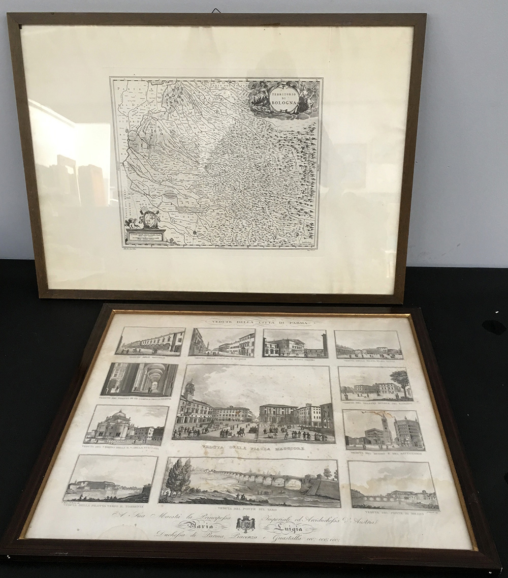 Autori vari, lotto composto da due stampe raffiguranti "Vedute della citta di Parma" e "Territorio di Bologna", misure ed epoche diverse, in cornici (difetti)