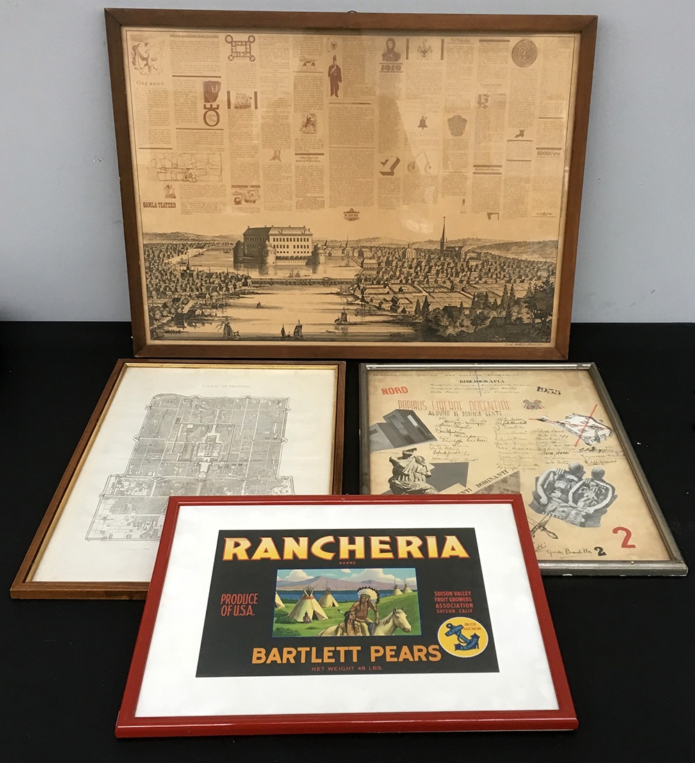 Lotto composto da una "Pianta di Pechino", un quadretto pubblicitario e due riproduzioni diverse, misure diverse, in cornici (difetti)