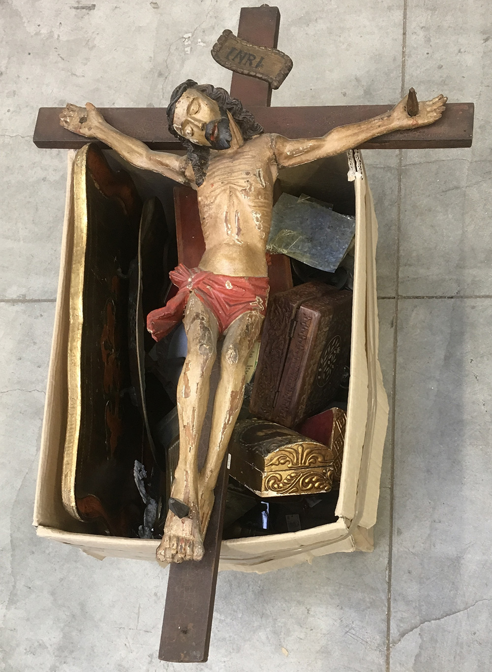 Lotto composto da un crocifisso in legno policromo ed un cartone contenente numerosi oggetti di vario genere (difetti)
