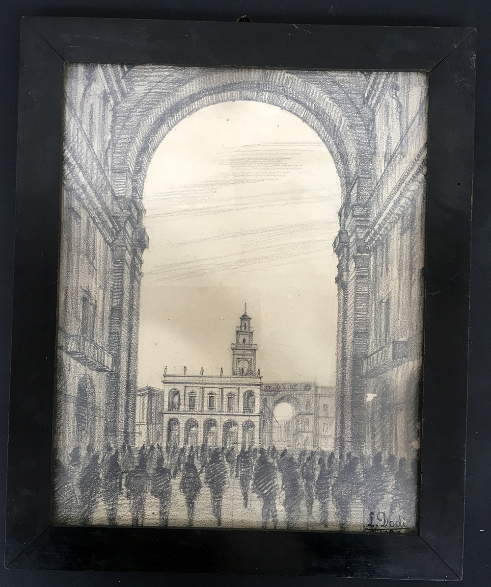 L. Dodi, "Scorcio di Piazza Duomo a Milano", carboncino su carta (cm 38 x 30)...
