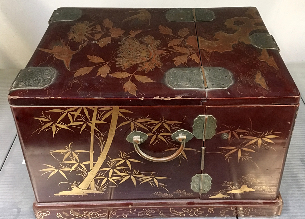 Toilette da viaggio in legno laccato e decorato a motivi floreali, due antine...