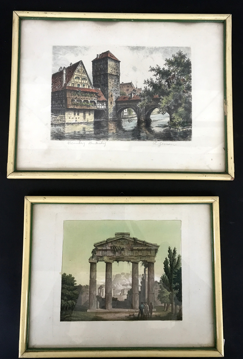 Lotto composto da una stampa e un'acquaforte a colori di soggetto e misure diverse, in cornici (lievi difetti)