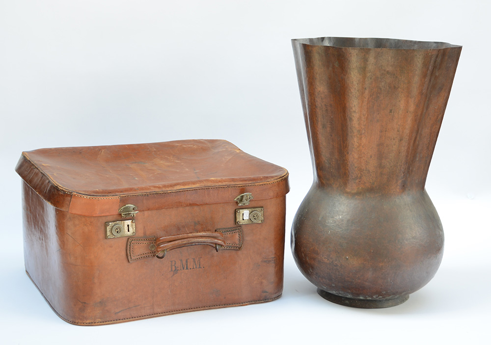 Lot 4120 | Lotto composto da un portaombrelli in rame e una valigia in cuoio (difetti)
