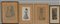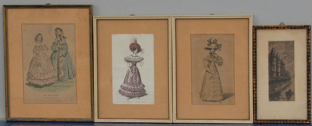 Lotto composto da tre incisioni colorate raffiguranti la moda femminile e un'acquaforte con scorcio di paesaggio, in cornici (difetti)