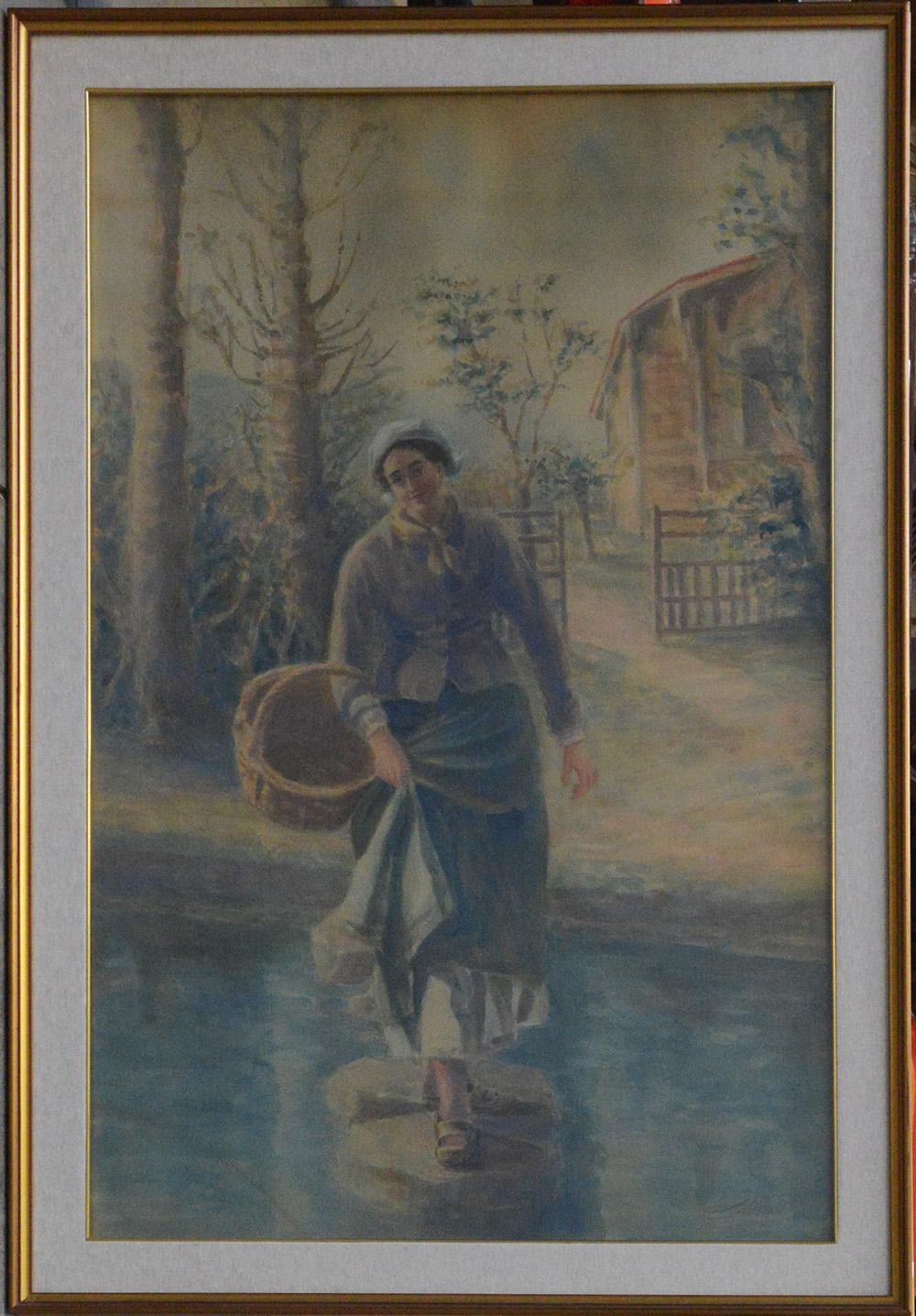 A. Nardi, "Contadina al fiume", acquerello su cartoncino (cm 110x72), firmato in basso a destra, in cornice (lievi difetti)