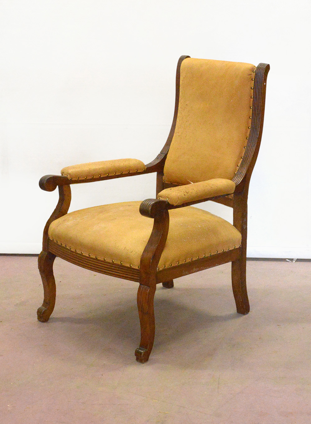 Poltrona da riposo in noce con montanti e braccioli scanalati, gambe anteriori sagomate, secolo XIX (difetti)