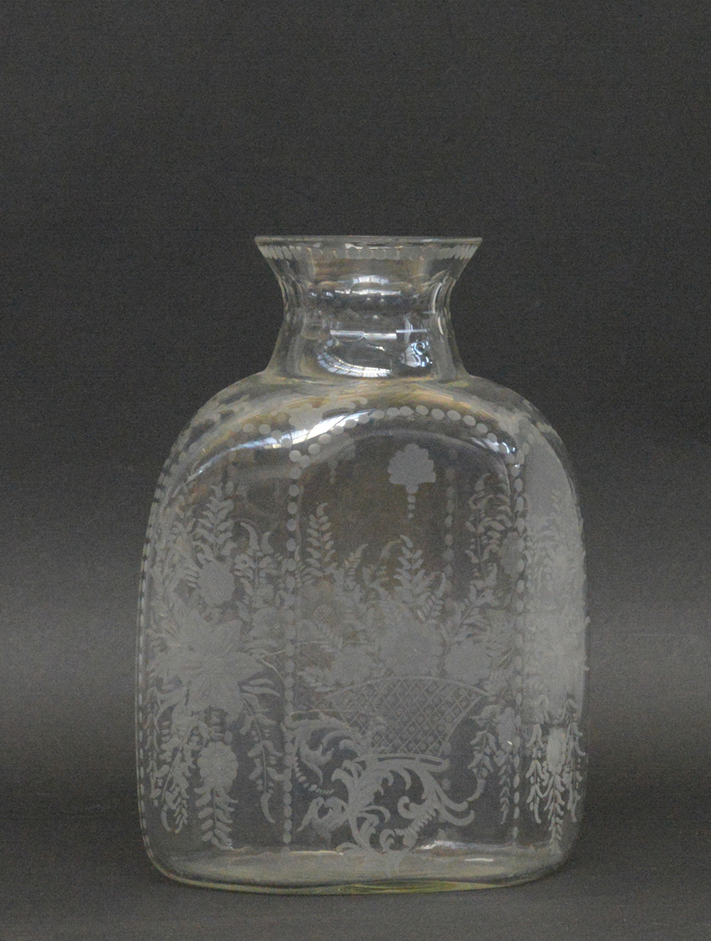 Vaso in vetro a base esagonale con decori floreali molati, secolo XIX (h cm 32)