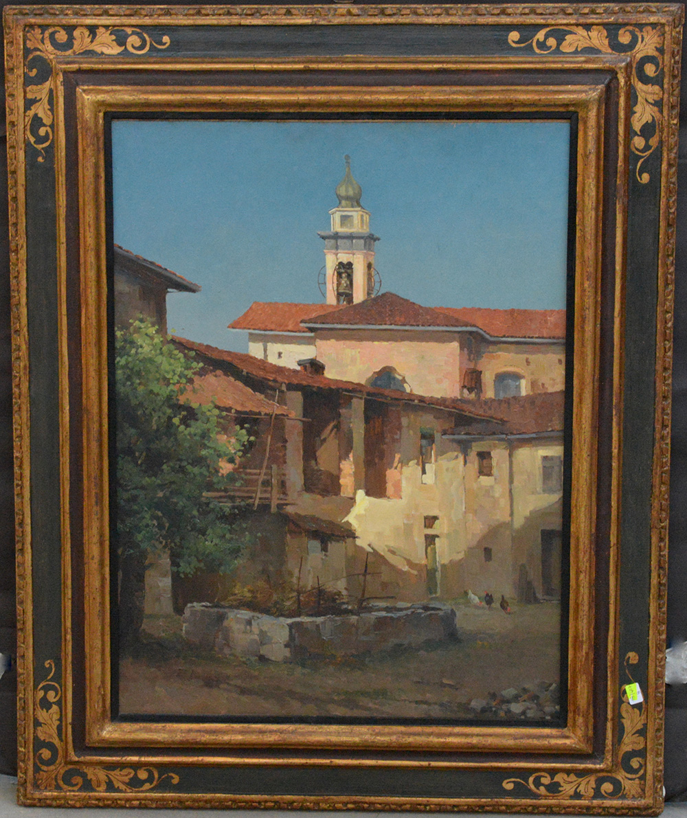 Ignoto "Scorcio con campanile" olio su compensato (cm 62x47) In cornice