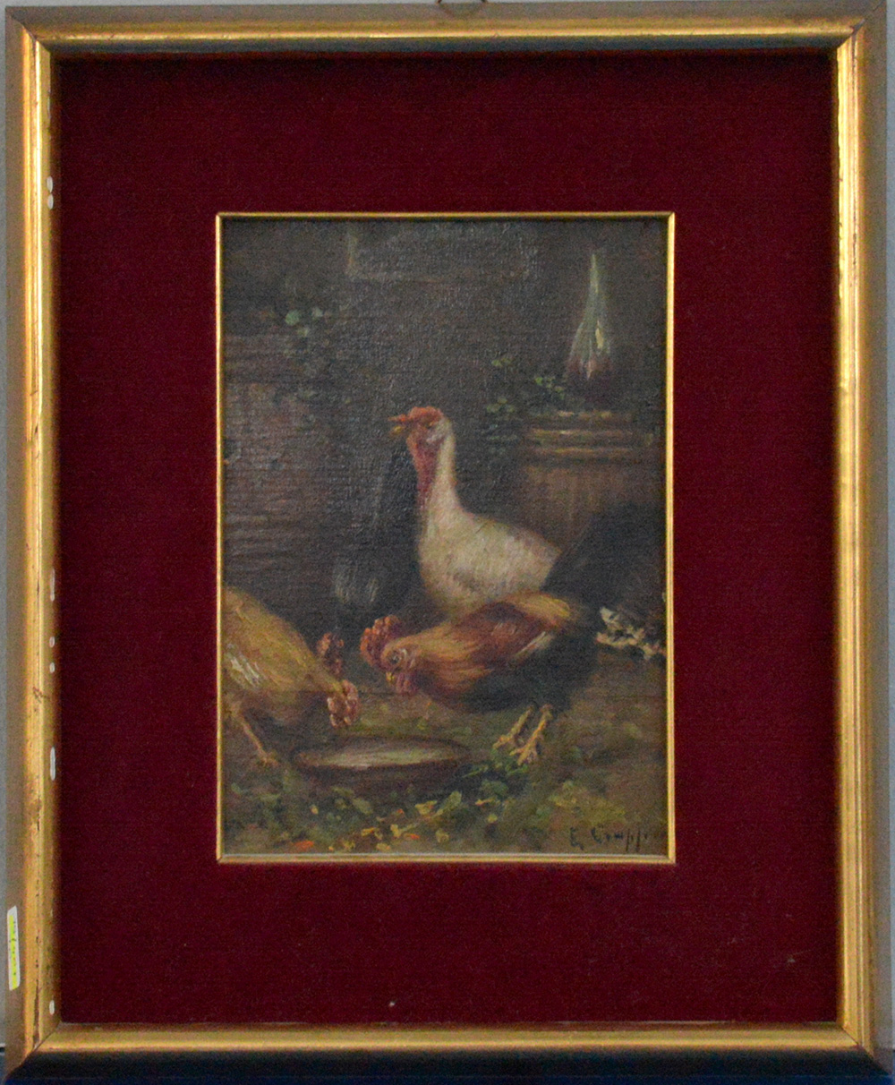 Firma indecifrata "Le galline" olio su compensato (cm 18x13) Firmato in basso...