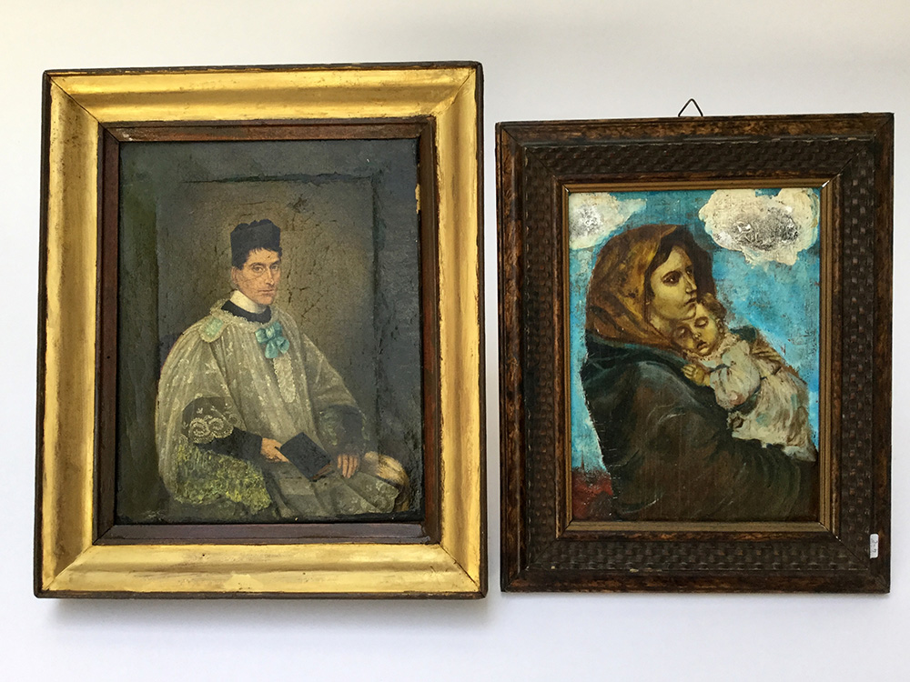 Lotto composto da un dipinto ad olio su tela raffigurante un prelato ed uno su tavola raffigurante una madre con bambino, misure differenti, in cornici (difetti e restauri)
