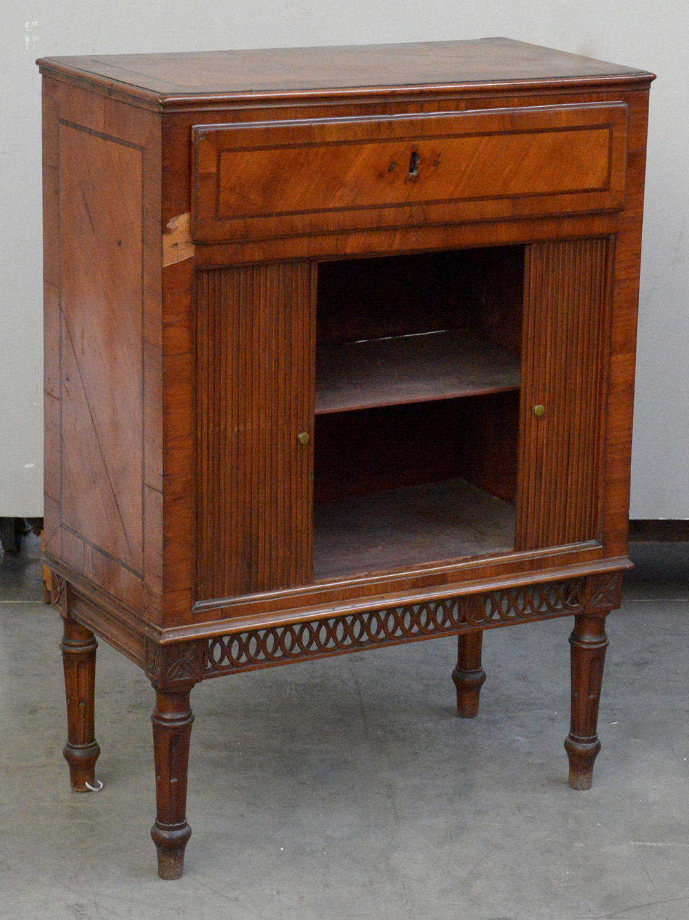 Mobiletto lastronato in noce e filettato, un cassetto ed anta a saracinesca, fascia traforata, gambe tornite e scanalate (cm 65x91x34) (difetti e mancanze)