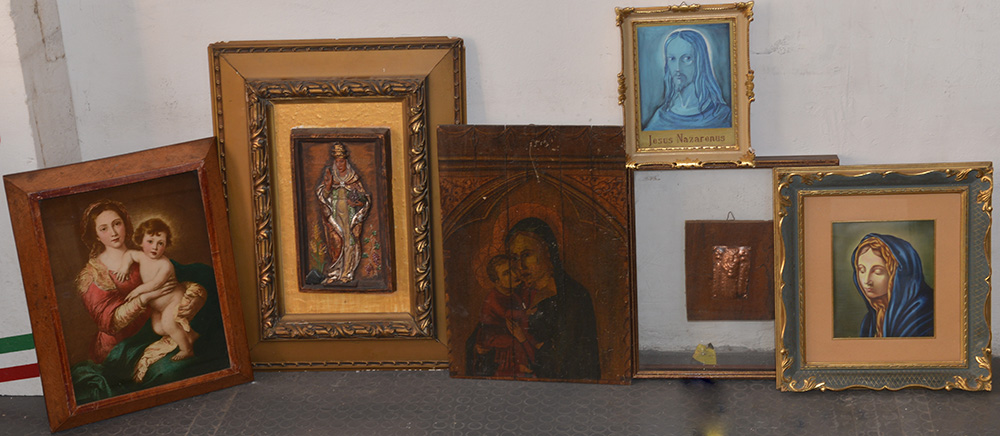 Cartone contenente numerosi quadri a soggetto religioso, autori, tecniche e misure differenti, in cornici (difetti)