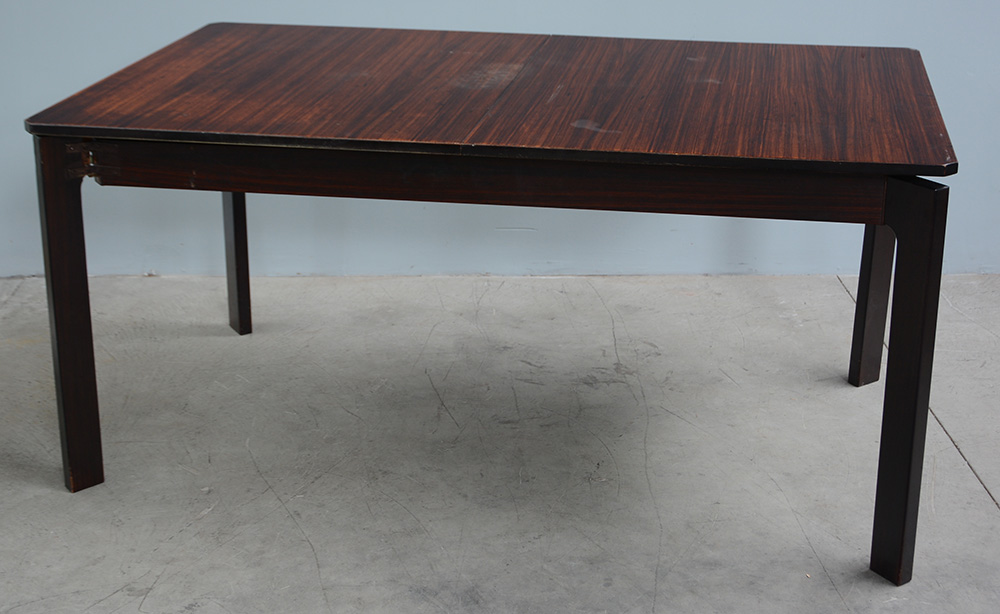 Tavolo allungabile in legno di palissandro indiano massello e impiallacciato. Produzione Dassi. (cm 155,5x74,5x88) (gravi difetti)