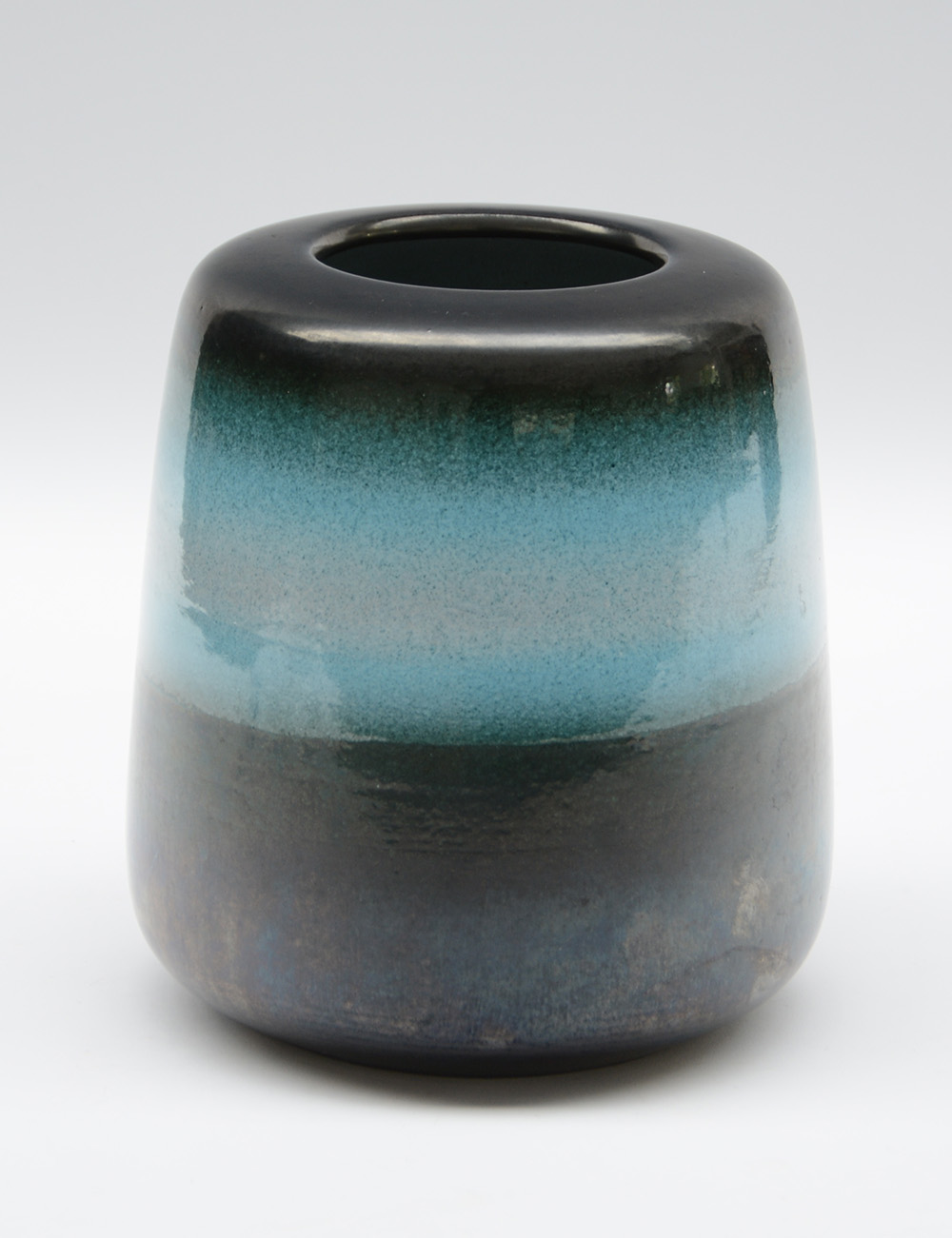 Vaso in ceramica smaltato in bruno metallico con fascia azzurra. Anni '60/'70. (h cm 19) (lievi difetti)
