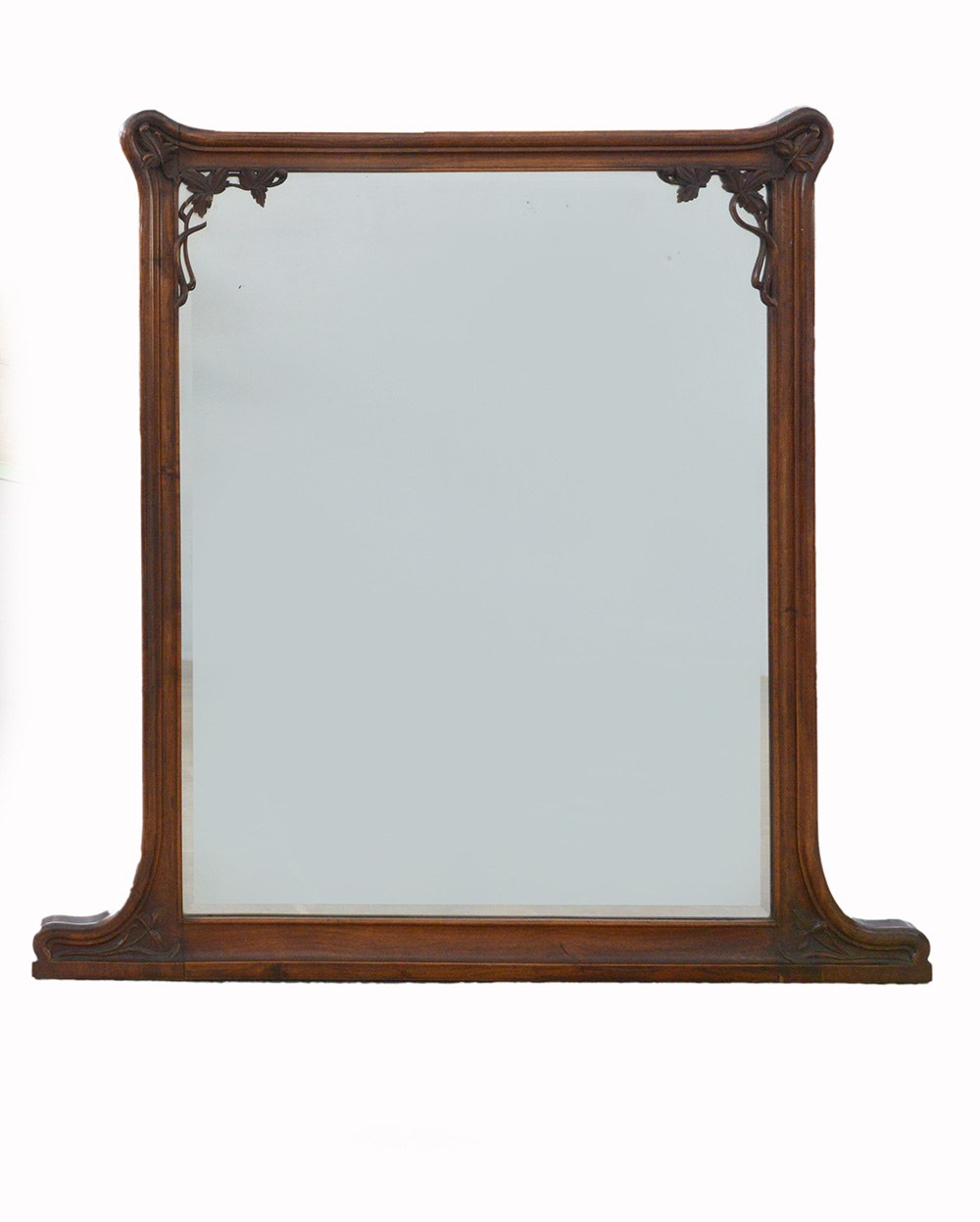 Caminiera art nouveau in legno di noce massello decorato con intagli floreali a "linea frusta". Italia, 1902ca. (cm 138x146) (lievi difetti)