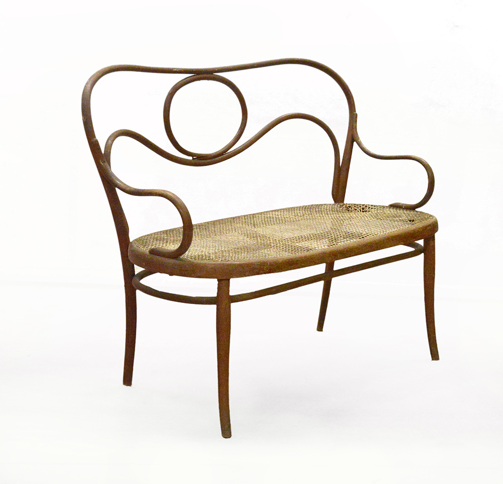 Divanetto a due posti in faggio curvato al vapore rivestito in cannette. Vienna, inizio secolo XX. (cm 114x96x63) (difetti e mancanze)