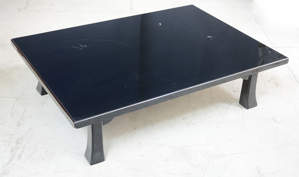 Tavolino da salotto in legno laccato nero lucido. (cm 120x32x84) (lievi difetti)