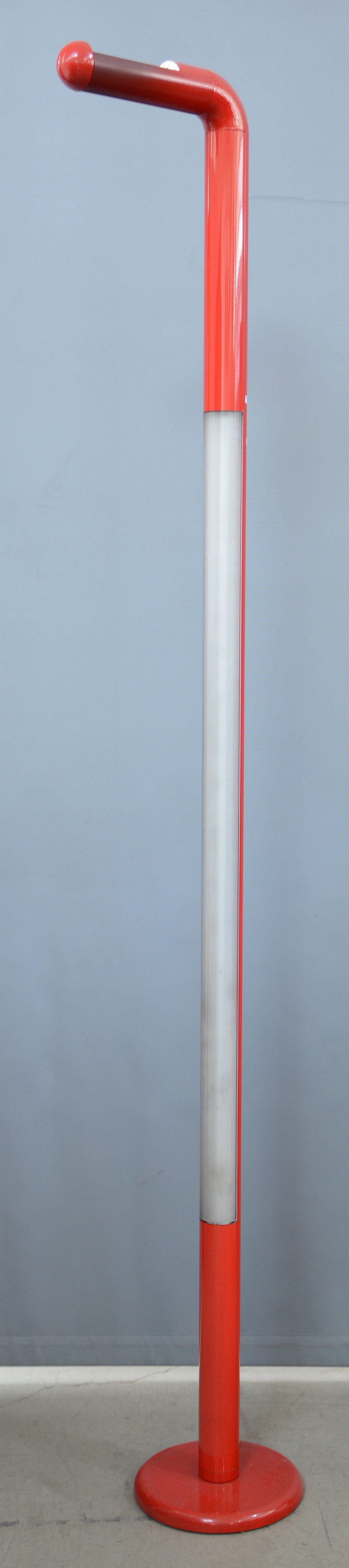 Lampada da terra in metallo laccato rosso con diffusore in metacrilato e lampada sommitale alogena. Anni '70. (h cm 200) (difetti)