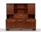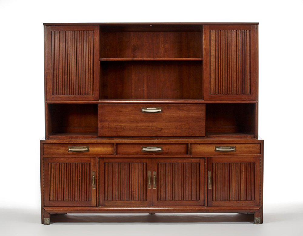 Credenza americana a due corpi in legno di ciliegio con parte inferiore a tre cassetti e quattro sportelli, parte superiore a ribalta, ante scorrevoli e vani a giorno, maniglie e minuterie in ottone, gambe rivestite in lamina di alluminio. Louisville, Kentucky U.S.A. seconda metà secolo XX. (cm 190x172x50) (lievi difetti)