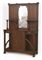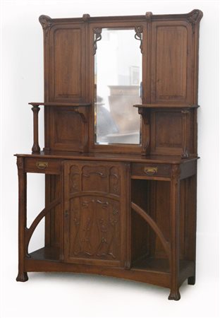 Mobile da ingresso art nouveau in legno di noce massello decorato con intagli floreali a "linea frusta" composta da un corpo ad anta centrale, cassettini e vani a giorno laterali e da una alzata a tre campi con specchio centrale e due mensole laterali. Italia, 1902ca. (cm 130x200x47) (lievi difetti)