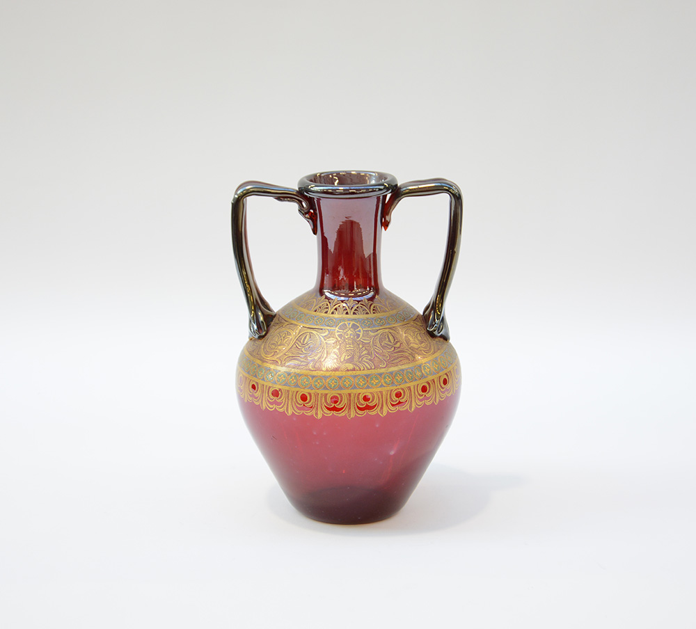 Anfora biansata in vetro soffiato rosso con decoro a racemi dorati e figura di cristo. Secolo XX. (h cm 25)