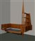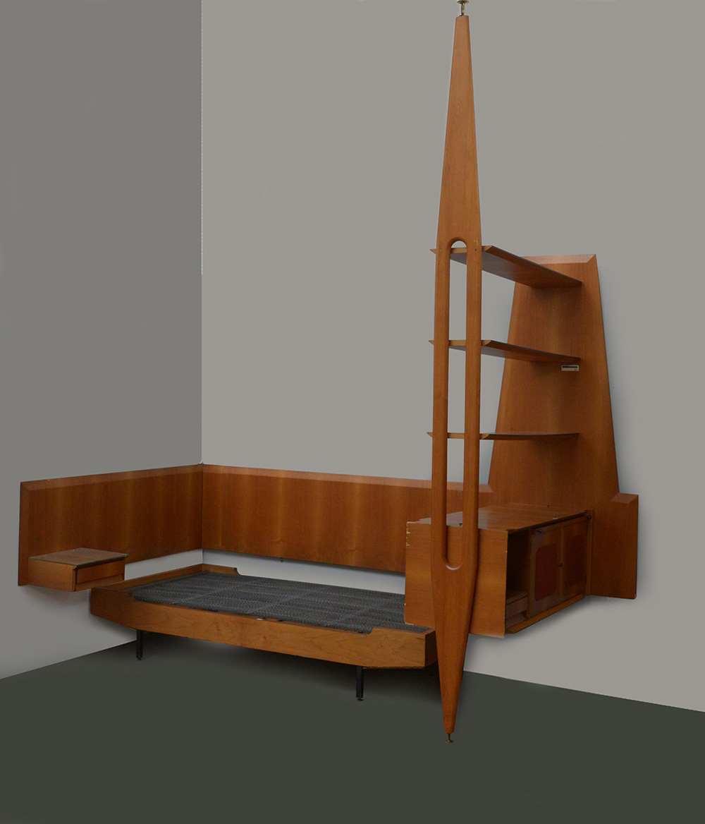 Lotto composto da una libreria a giorno a tre ripiani portalibri e uno stipo con scrittoio estraibile unita a letto singolo con boiserie e comodino pensile impiallacciati in noce. Italia, anni '70. (ingombro totale: cm 267x300x140) (difetti)