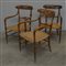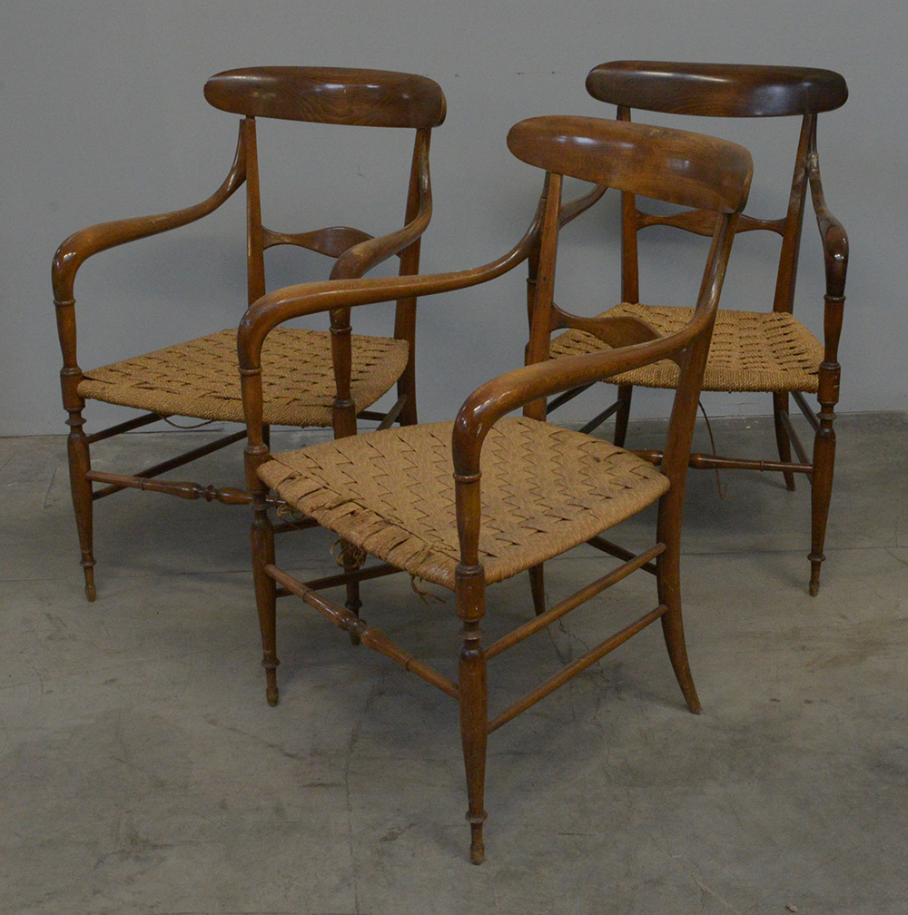 Tre poltroncine chiavarine in legno massello con seduta in corda intrecciata. Italia, anni '70. (cm 55x86x63) (gravi difetti)