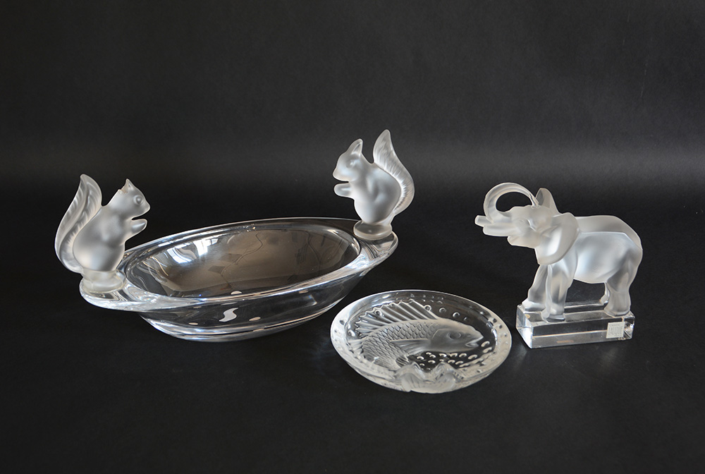 Lotto composto da un posacenere con carpa e un elefantino in cristallo marcati Lalique, uniti a un centrotavola con scoiattoli marcato Sevres. (misure diverse) (lievi difetti)
