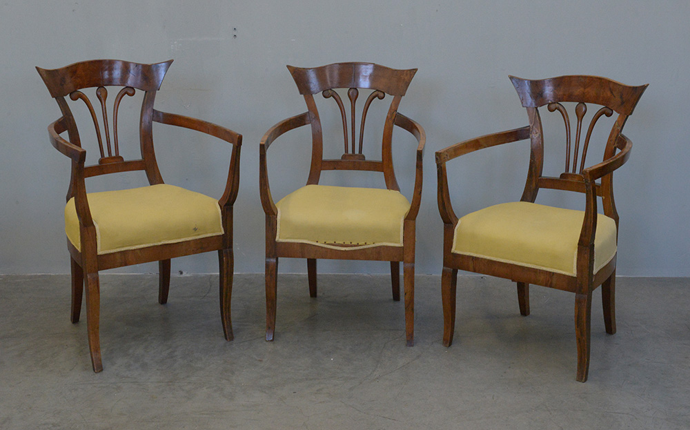 Gruppo di tre poltrone con schienale a giorno sagomato, braccioli curvi e gambe mosse. Secolo XIX