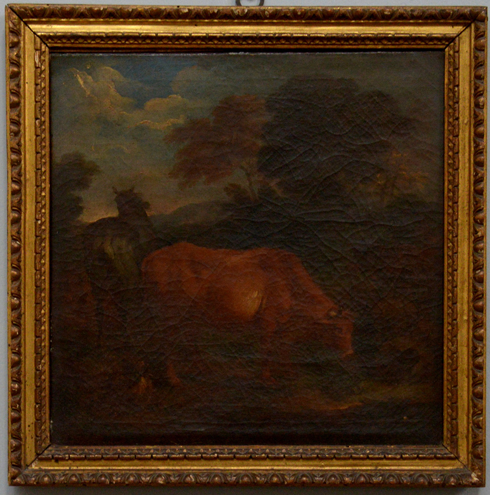 Artista nordico del secolo XVIII “Paesaggio con cavallo e mucche”, olio su tela (cm 33x33). In cornice (difetti e restauri)