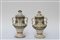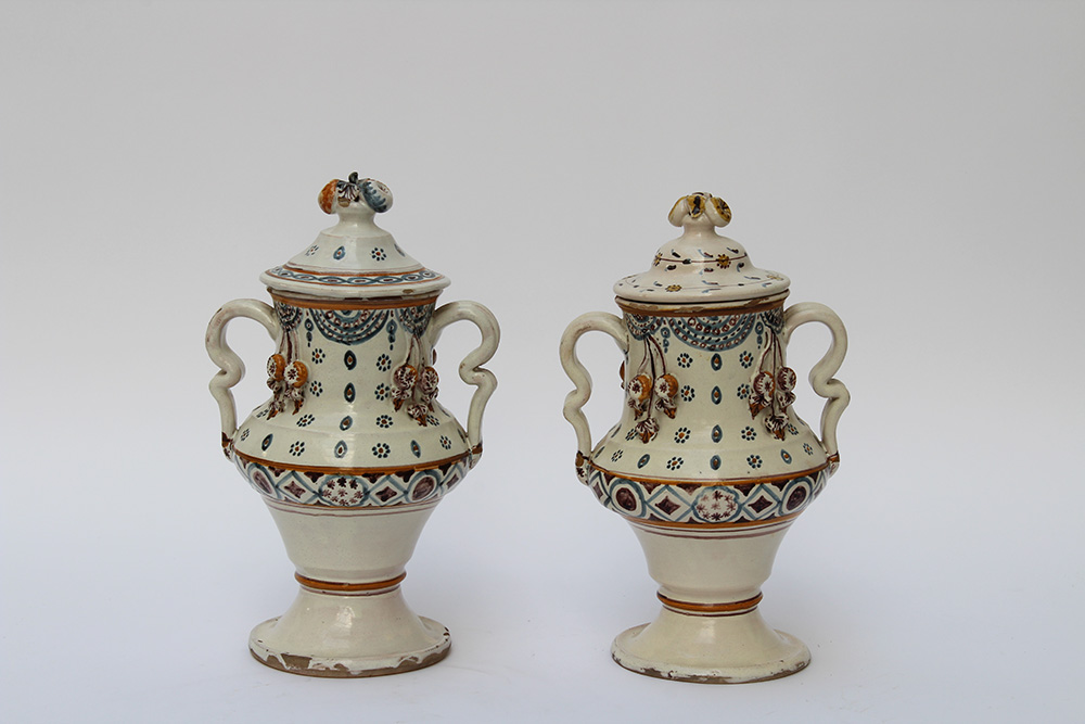 Coppia di vasi biansati in terracotta smaltata a fondo bianco, decorata in policromia a rilievo a motivi stilizzati e frutta (h cm 34) (difetti)