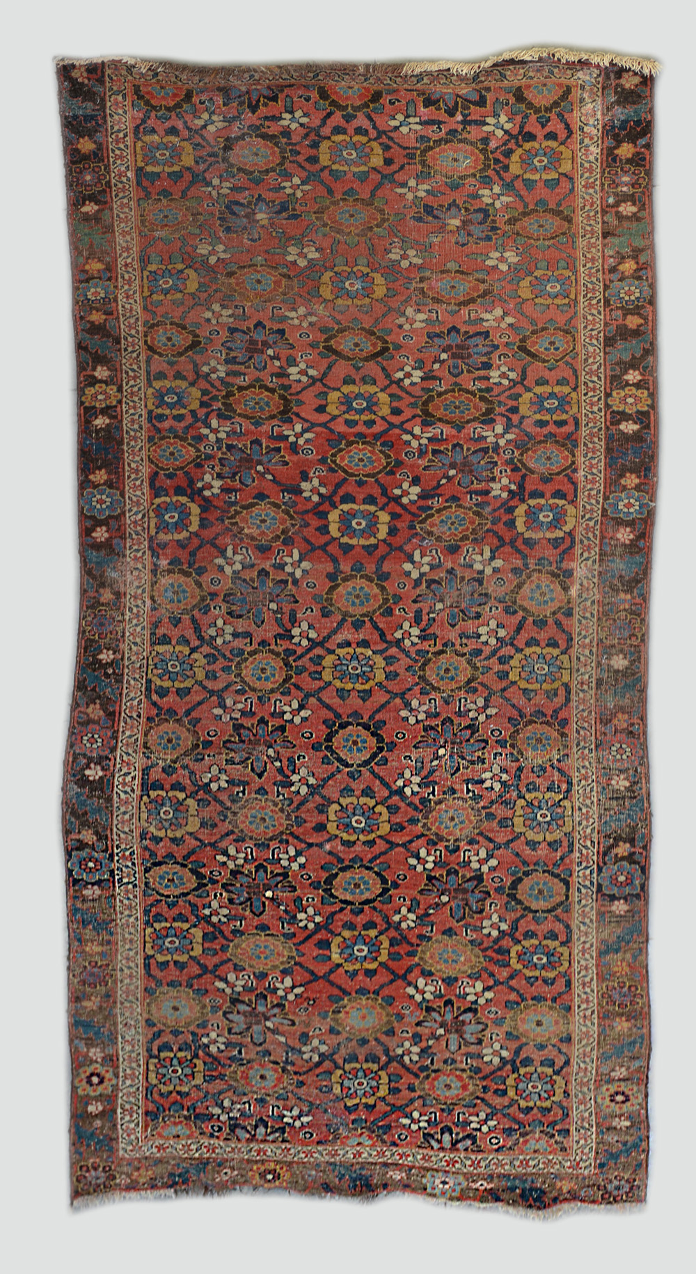 Tappeto Bidjiar, Persia secolo XIX. Disegno Veramin policromo su fondo rosso (cm 330x133) (difetti, rapature e mancanze)