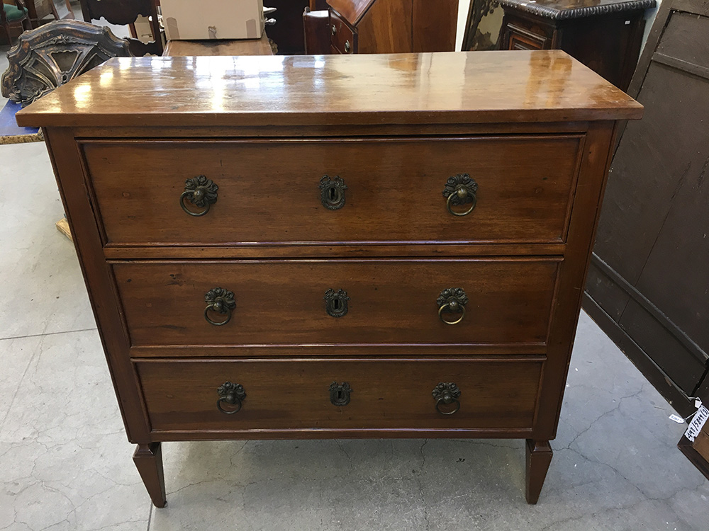 Cassettone lastronato in mogano a tre cassetti. Piedi ad obelisco rovesciato...
