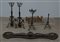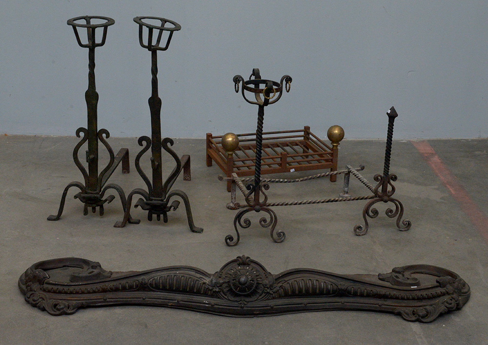 Lotto composto da tre coppie di alari ed una base, in ferro battuto, metallo e bronzo (difetti)