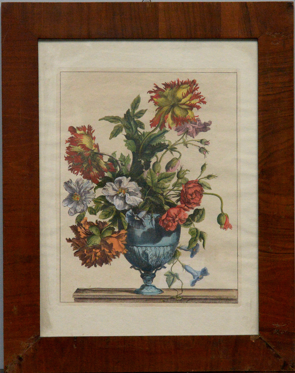 Antica incisione acquarellata raffigurante vaso di fiori (cm 60x45) in cornice lastronata (difetti e mancanze)