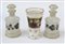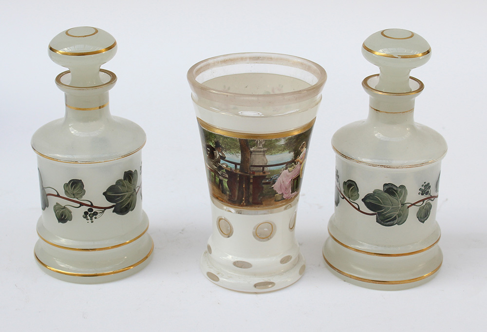 Lotto composto da due bottigliette in vetro lattimo ed un bicchiere in vetro molato decorato con scena galante