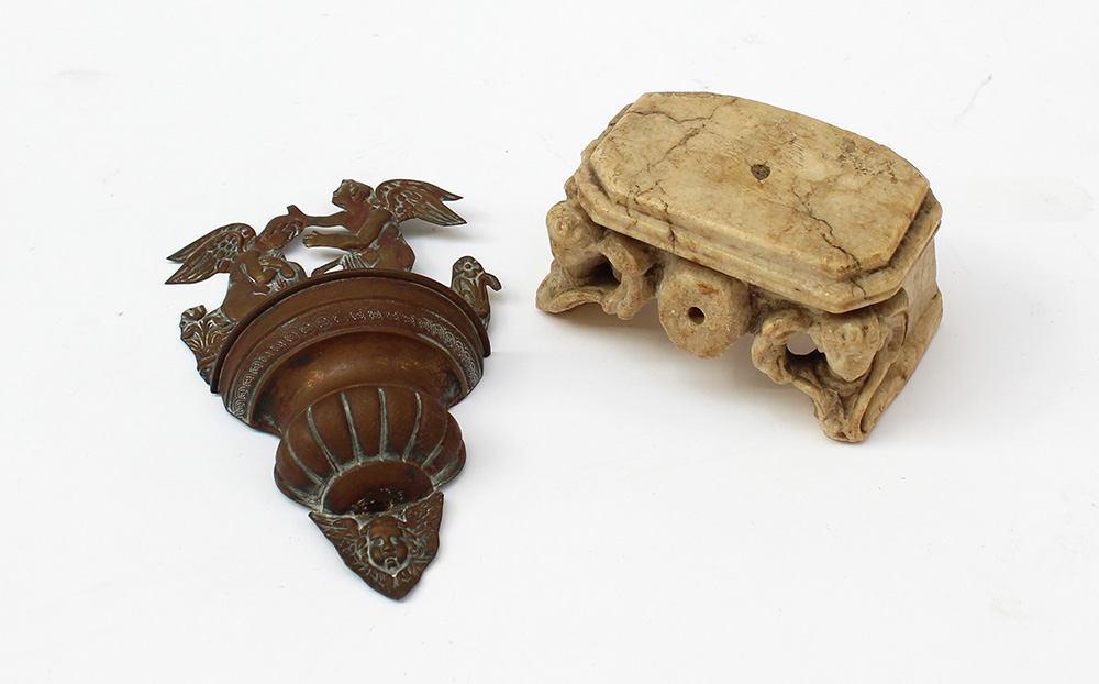 Lotto composto da un'antica base ed un'acquasantiera in rame sbalzato del sec. XVIII (difetti)