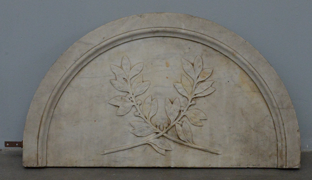 Altorilievo a mezza luna in marmo scolpito al centro a rametti con frutta (cm 43x76) (difetti)