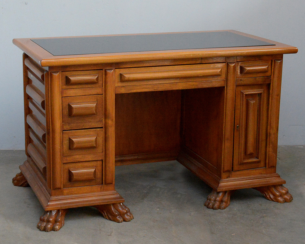 Scrivania a cinque cassetti ed un antina interamente riquadrata e pannellata, piano in vetro fumè, piedi a zampa ferina (cm 130x80x70) (difetti)