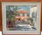 "Scorcio di paese con figura seduta al tavolo e ombrelloni" '67, olio su tela firmato e datato al retro (cm 50x60) in cornice (Difetti)